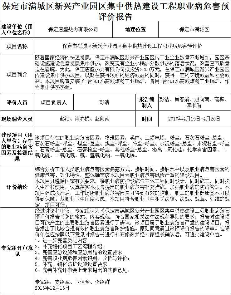 保定市满城区新兴产业园区冀中供热建设工程职业病危害预评价
