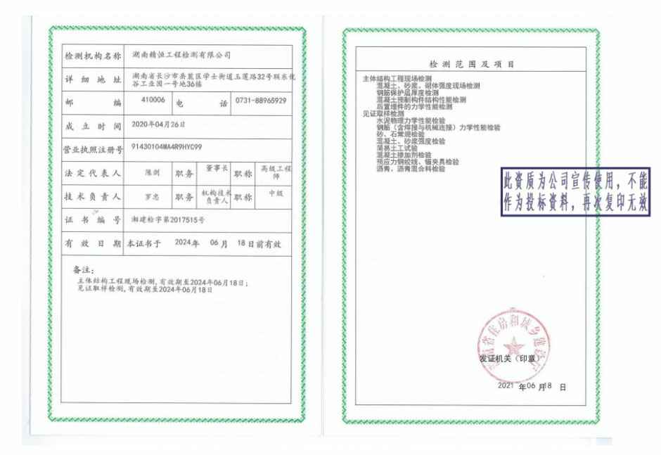 公司近两年将不断扩充资质,提升检验检测能力,届时将提供近 400 个工作岗位, 以“遵守法律法规,全心全意的为客户服务”为宗旨,以“公正求实、优质高效、质量为本、 信誉为上”为质量方针。重视高素质、高层次技术人才的培养,致力于新技术、新手段 的开发和应用。按照“开放、流动、竞争、协作”的原则,建立高效有序的现代企业制度 和充满活力的检测经营机制,立足长沙,辐射湖南,走向全国,为社会提供卓越的技术 服务。